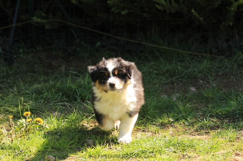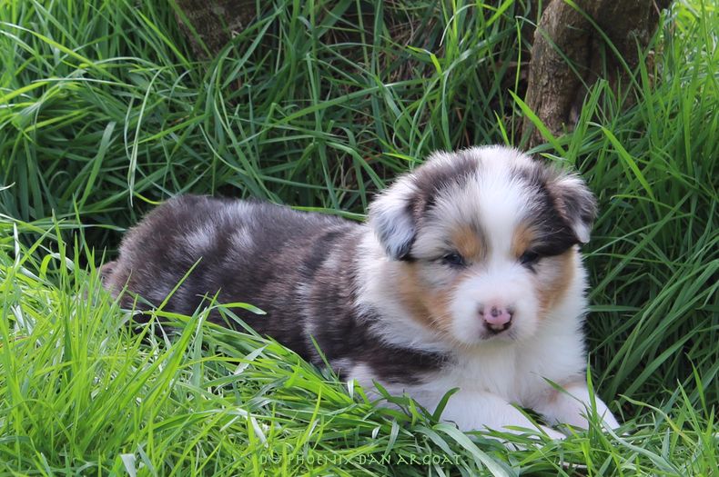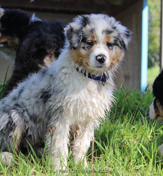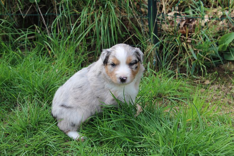Femelle bleu merle, queue écourtée (partielle à la naissance).