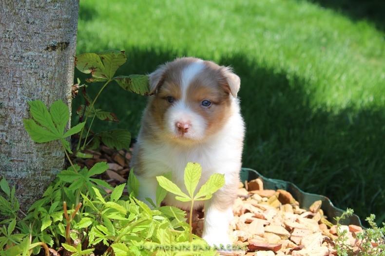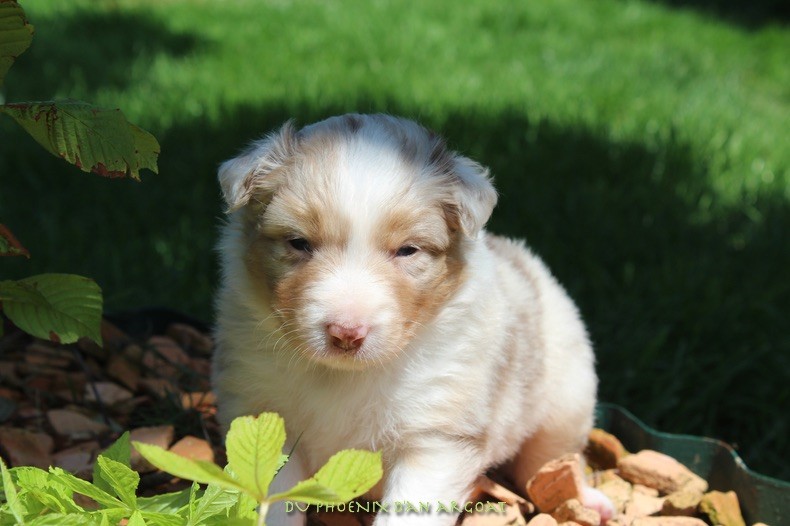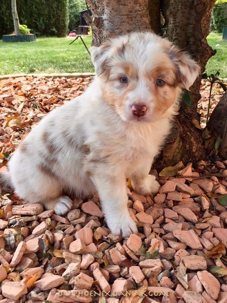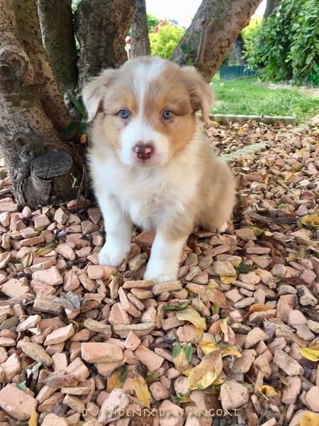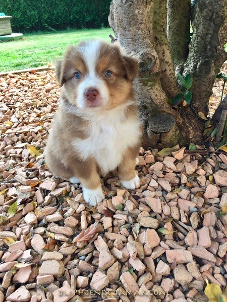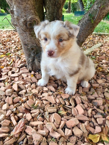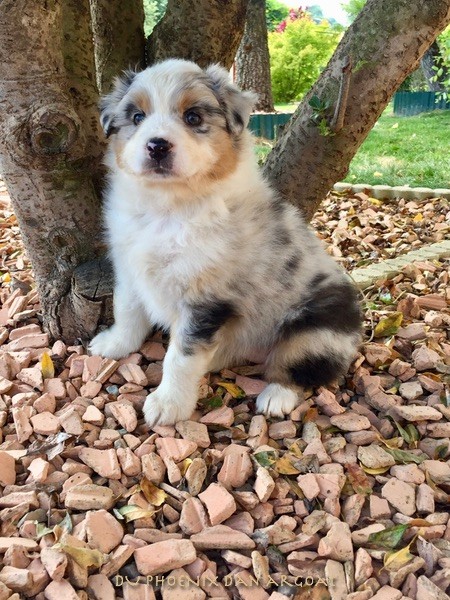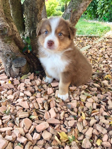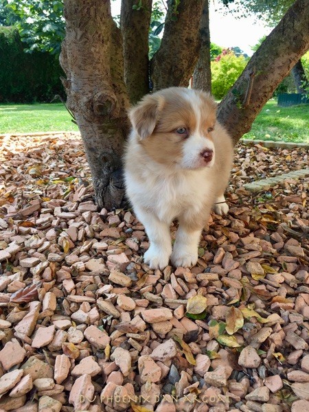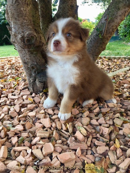 "Epouse de Eros, dieu de l'amour" Femelle rouge merle, queue courte (née incomplète). Photos à 6 semaines. Facilités de paiement. Parents testés et indemne (dysplasie, maladies oculaires) Contact pour plus d'infos.