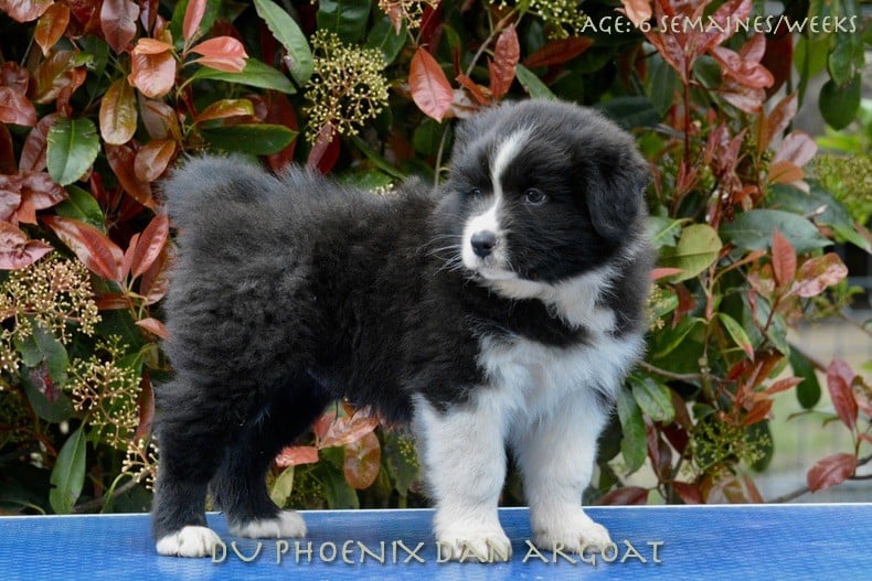 Mâle noir tricolore, queue longue. Synok est très attaché à ses humains, il aime leur présence. Il est doté d'une grande douceur et fait preuve de calme tout en étant très joueur. Parents testés et indemnes (dysplasie, maladies oculaires, tests génétiques). Familles choisies et guidées, chiots suivis. Facilités de paiements. Priorité au caractère. 3 autres chiots rouge et rouge merle plus grand disponibles.